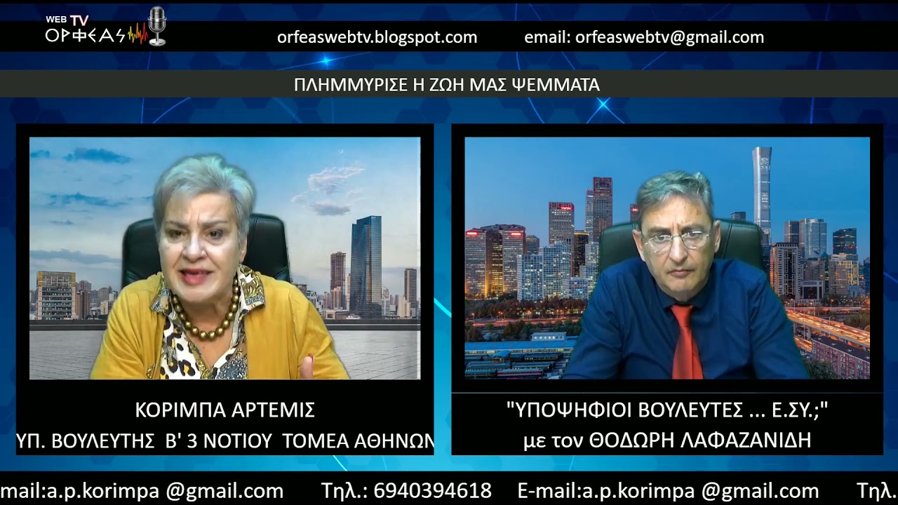 Η Άρτεμις Κορίμπα, υποψήφια βουλευτής της ΕΛΛΗΝΩΝ ΣΥΝΕΛΕΥΣΙΣ, στην εκπομπή «ΥΠΟΨΗΦΙΟΙ ΒΟΥΛΕΥΤΕΣ Ε.ΣΥ.», με τον Θοδωρή Λαφαζανίδη.